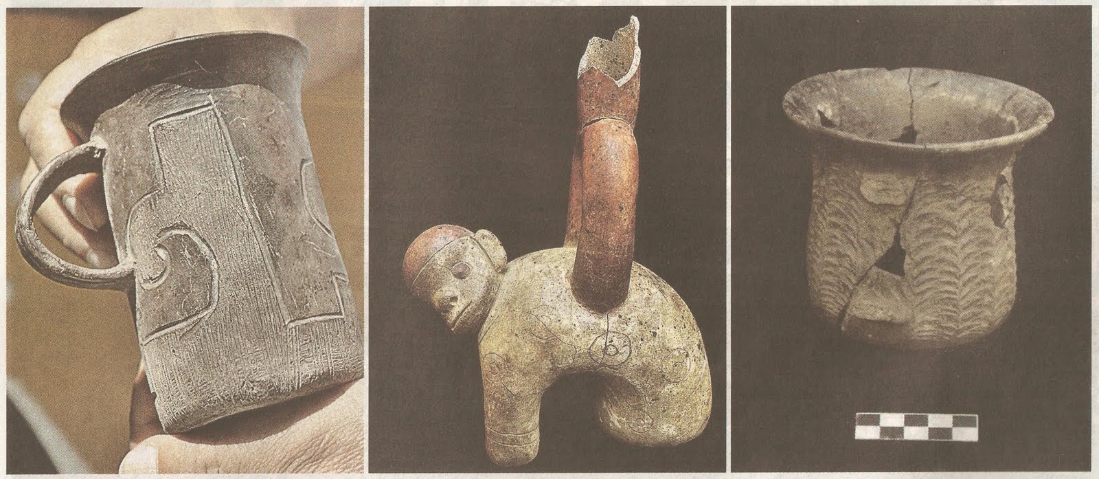 Por ejemplo hallaron cerámicas con rasgos típicos de Chavín y otras cerámicas rotas por los huaqueros, pero que al unirlos develan su forma, acabo y belleza.
